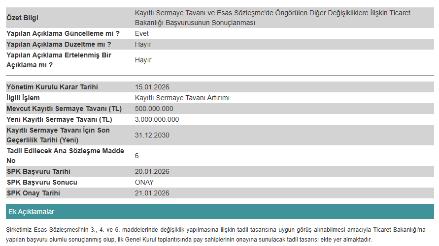 Ticaret Bakanlığı’ndan alınan onayın ardından, esas sözleşme tadili şirketin yapılacak ilk Genel Kurul toplantısında pay sahiplerinin onayına sunulacak. Genel Kurul onayının ardından yeni tavan resmen yürürlüğe girecek.